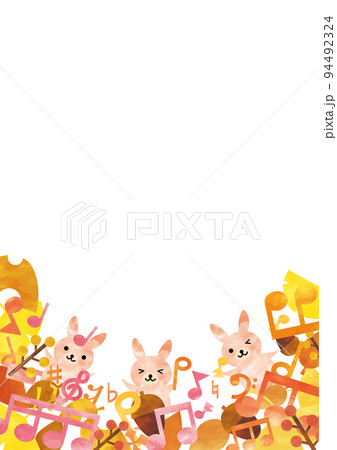 秋の水彩の音符と枯れ葉で遊ぶうさぎたちの下フレーム 縦