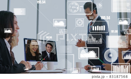 Manager explaining company investment strategy to remote colleagues during online videocall meeting conference. Diverse corporate team working late at night in startup office. Business concept