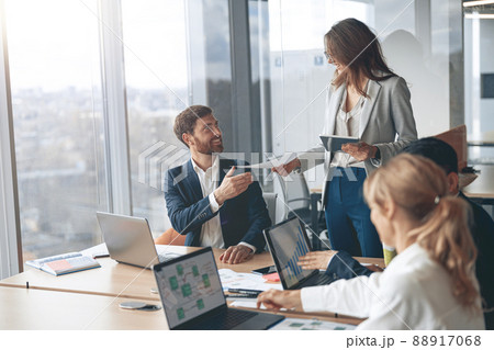 group of four happy young asian corporate people teammates meeting discussing business in office