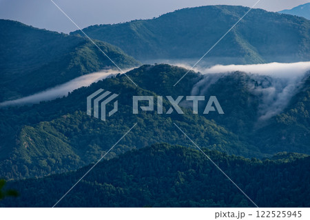 初夏の浅草岳稜線から見る田子倉湖の雲海と会津の山並み