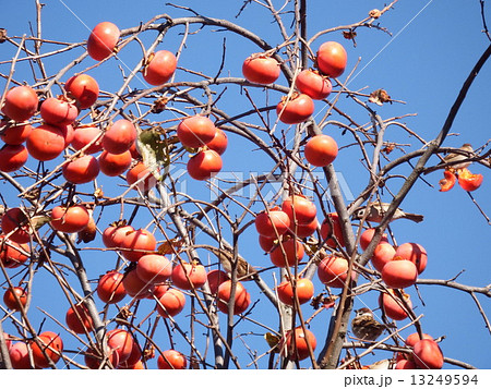 晩秋の候、澄んだ青空を背景にして、熟れた柿の実がなっている。
