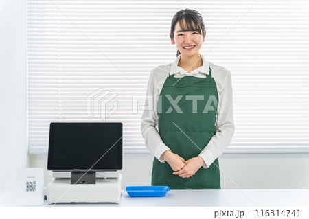コンビニ・スーパー・売店でレジ打ちをする店員の男性コンビニ, レジ, エプロン, レジ打ち, コンビ