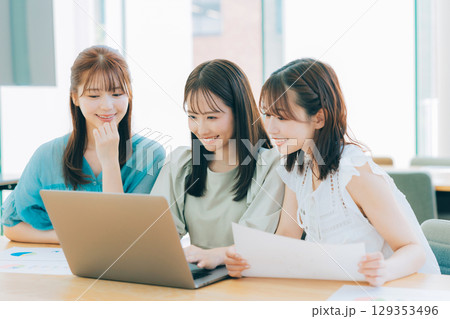 パソコンを見ながら打ち合わせをする3人の女性