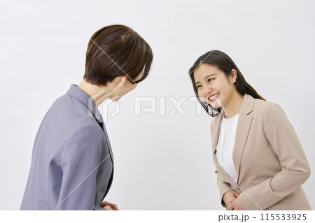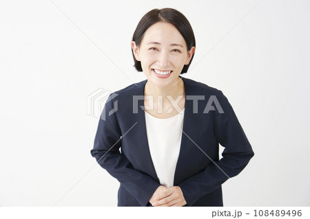 笑顔でお辞儀する中年のビジネスウーマン 白背景 カメラ目線