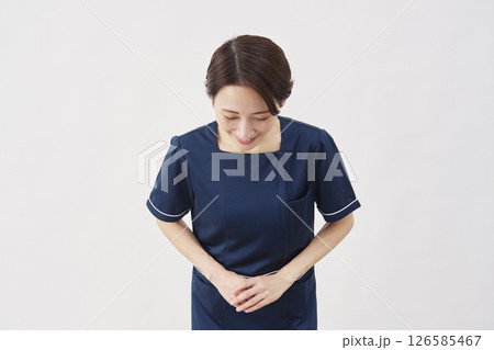 笑顔でお辞儀する女性の医者 白背景 カメラ目線