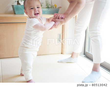 母親の手を握りつかまり立ちをするハーフの赤ちゃん