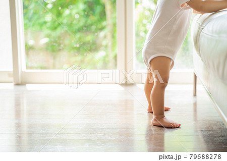 つかまり立ちをする赤ちゃんの足