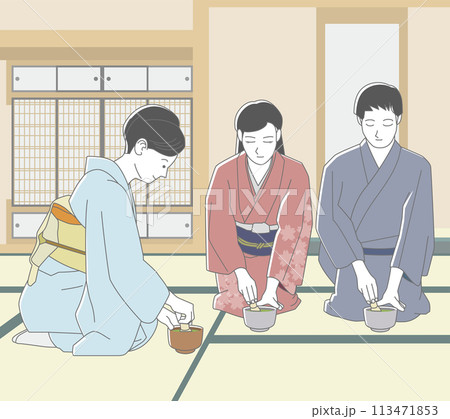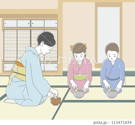茶道体験をす日本人の男女の小学生