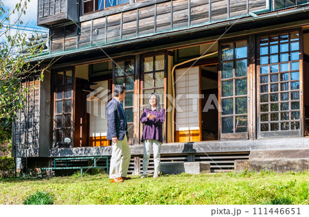 古民家の縁側で話をするシニア夫婦とビジネスウーマン