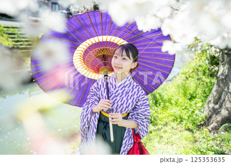 桜の下で袴を着た女子生徒