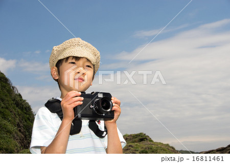 海岸で撮影する子供。小さなカメラマン(三浦半島、長浜海岸)