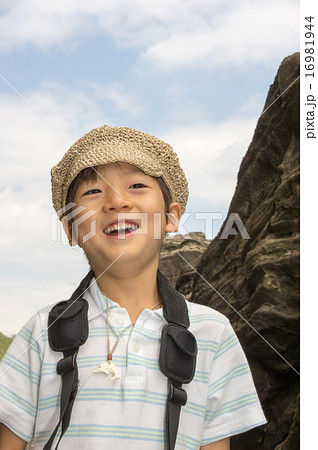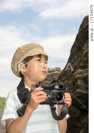 岩場に座り撮影する子供。小さなカメラマン(三浦半島、長浜海岸)