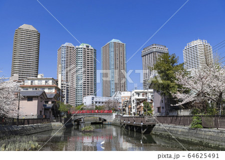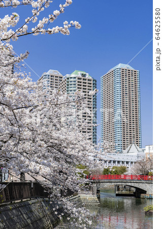 都市風景 満開の桜と佃島の高層マンション群 東京都中央区
