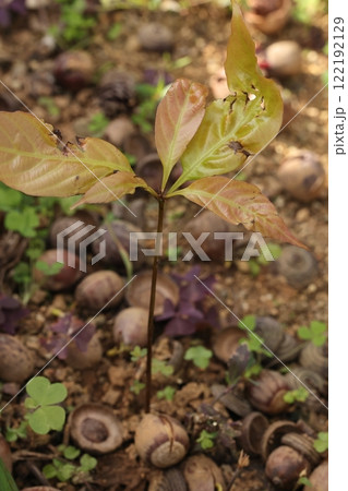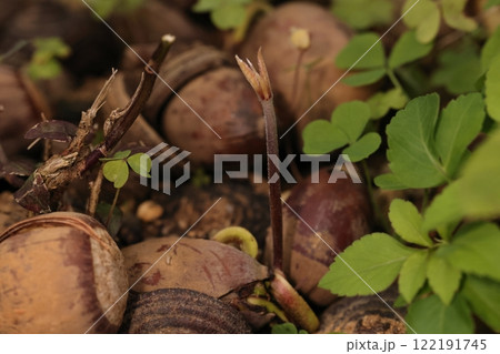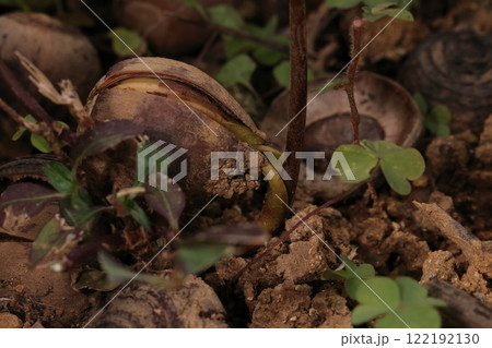 自然 植物 オキナワウラジロガシ、実生です。先端が割れたドングリから根と芽が出ているようです