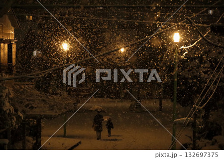 日本の日常生活 雪の降る夜に街の小さな公園を歩く母と幼い子供