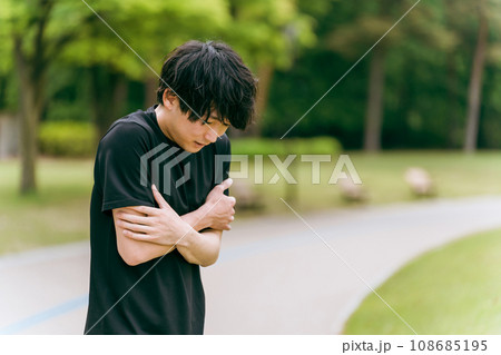 運動後に汗冷えして寒い男性(半袖・冷え性・低体温症・悪天候)