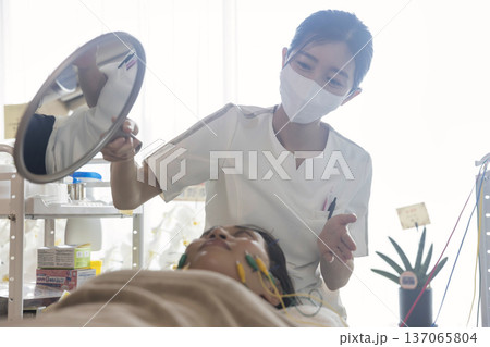 美容鍼に鍼電極低周波治療器をした状態を患者に見せて説明をする鍼灸師女性