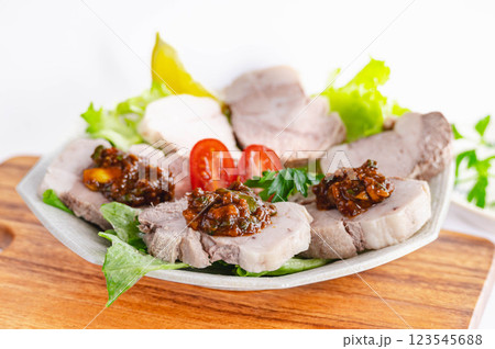 ねぎ味噌をのせた茹で豚