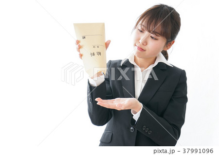 給料袋を持ってびっくりしている30代のビジネスウーマン