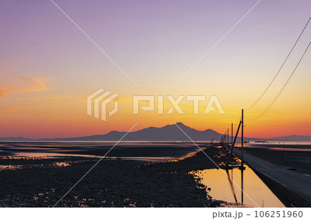 夕焼けの干潟に伸びる長部田海床路(熊本県宇土市)