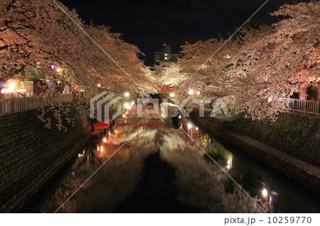 大垣市の水門川の船町港跡の住吉灯台と夜桜