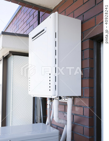 住宅の屋外に設置されたガス給湯器の点検をする作業服の男性
