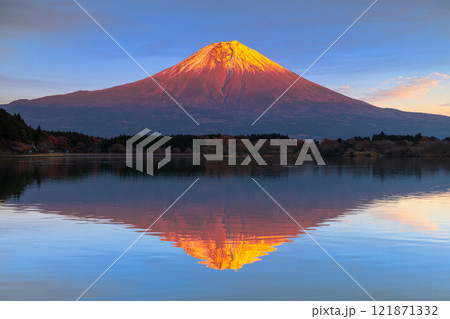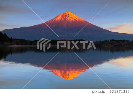 静岡県富士宮市佐折 朝霧高原の田貫湖から望む夕暮れの冠雪した世界遺産富士山と湖面の逆さ紅富士