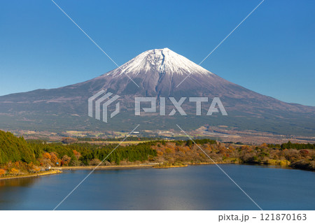 静岡県富士宮市佐折 朝霧高原の田貫湖畔展望台から望む冠雪した世界遺産富士山