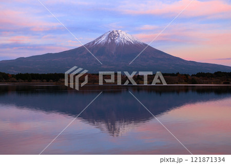 静岡県富士宮市佐折 朝霧高原の田貫湖から望む夕暮れの冠雪した世界遺産富士山と湖面の逆さ富士
