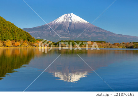 静岡県富士宮市佐折 朝霧高原の田貫湖から望む冠雪した世界遺産富士山と湖面の逆さ富士
