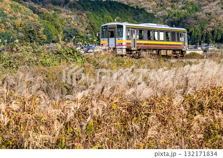 晩秋の姫新線 ススキの穂がなびく向こうを走る津山駅行き普通列車1 兵庫県佐用郡佐用町