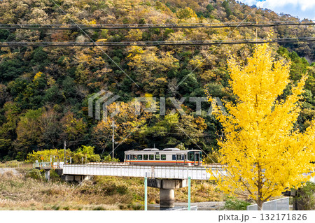 晩秋の姫新線 佐用川の鉄橋を渡る播磨新宮駅行き普通列車2 兵庫県佐用郡佐用町