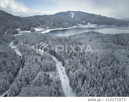 佐野坂峠から見る青木湖の冬景色 長野県白馬村(ドローンによる空撮)
