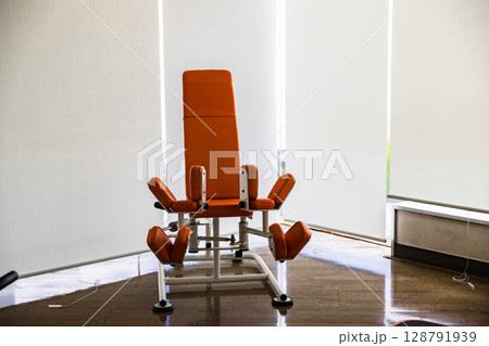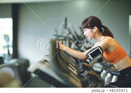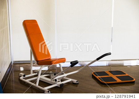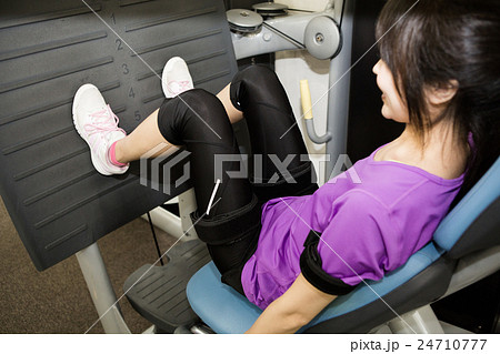加圧ベルトを巻いてレッグプレスで足を鍛える女性