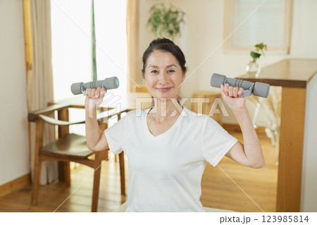 元気よくペットボトル体操をする車いすに座ったシニア女性