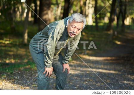 公園のベンチに座るシニア男性 疲れ