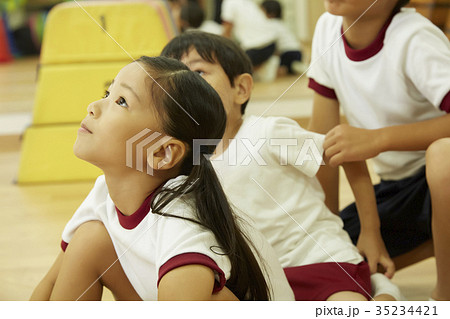 校庭に座る体育着の小学生 運動会 体育イメージ