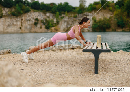 Outdoor Fitness A Woman Engaging in Energetic PushUps by the Calm Water Surface