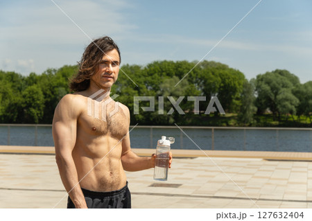 Shirtless young man holding water bottle. Outdoors. Summer.