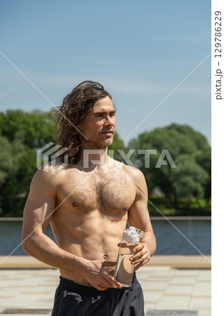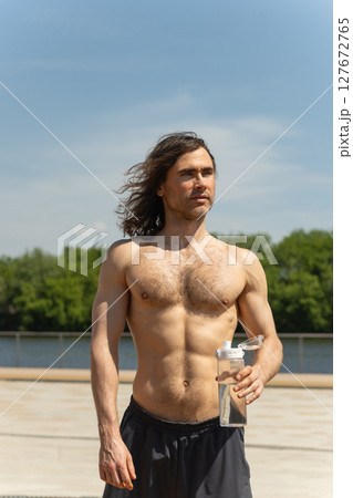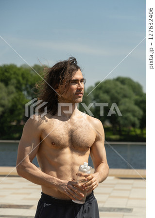 Shirtless handsome fit young man with long hair holding water bottle while standing outdoors on sunny day against nature background at park. Heat summer. Outdoors. Water balance.