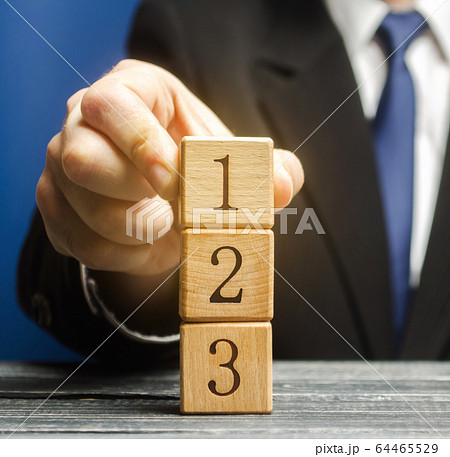 Businessman puts wooden blocks with the number 1 2 3. Task list. Alternate items and conditions for implementation. Contract road map. Organization and systematization, step by step instructions.