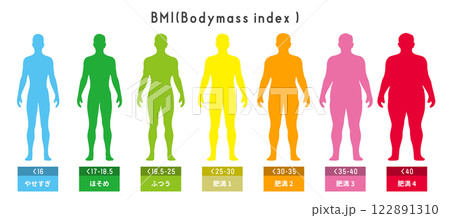 男性のBMI分類と体型比較の全身シルエット図 イラストセット