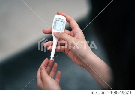 体温計で熱をはかる女性