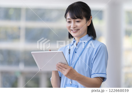 施設スタッフ イメージ タブレットを操作するミドル女性