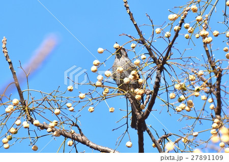 東京都三鷹市の野鳥、仙川に隣接する公園内のセンダンの実を咥えるヒヨドリ