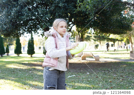 Pretty young girl throwing flying disc outdoors. Vacation and holiday concept