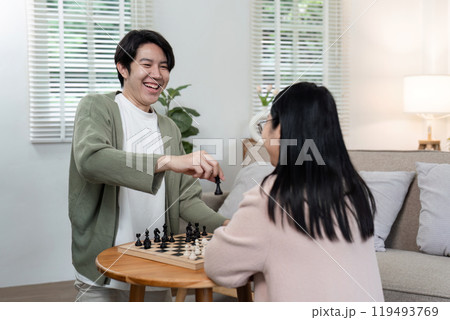 Mother and Son Enjoying Quality Time Playing Chess Together in a Cozy Modern Living Room