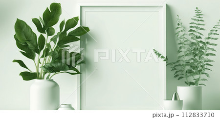 AI-generated content. Mock up white frame and green plant on desk, White colors.