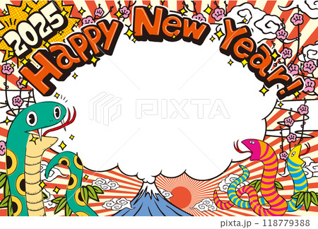 2025年賀状テンプレート「アメコミ風デザイン」ハッピーニューイヤー 手書き用スペース付パターン