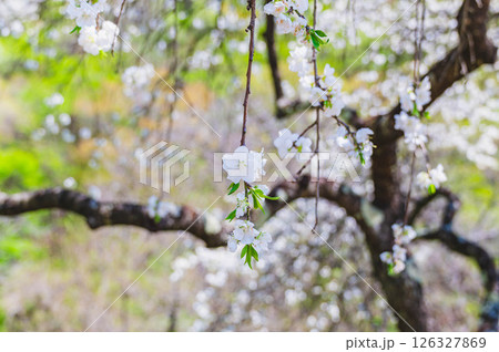 垂れ下がって咲く白い花桃